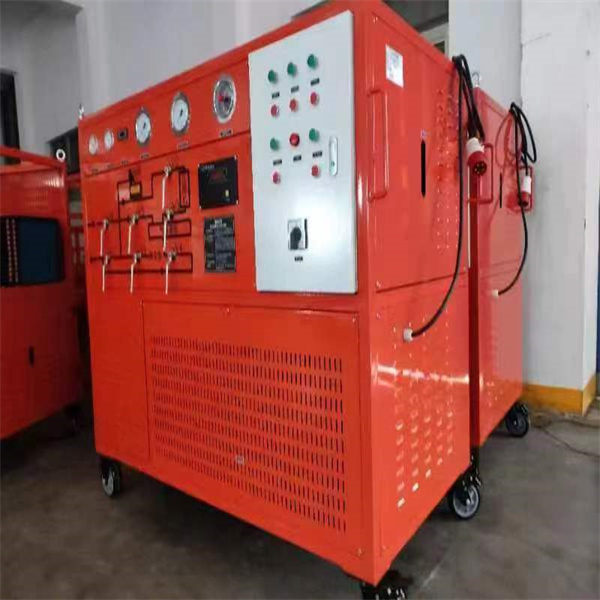一、工作原理和結構特征 HT-7Y型SF6氣體回收裝置具有回收、充放、凈化、抽真空、貯存、灌瓶等綜合性功能,系統比較完全。各功能的串聯或切換主要通過操作集中于面板一側的電控箱和球閥來完成。 回收裝置的基本工作原理是采用冷凍液化法。在回收時,利用壓縮機的抽吸性和壓縮性把SF6電器設備內一定壓力的SF6氣體吸入壓縮機,并壓縮至某一較高的壓力。同時利用R22制冷劑的低蒸發溫度特性,將較高溫度的SF6氣體冷卻至冷凝溫度進行液化、貯存。這樣連續抽吸至SF6壓縮機串聯運行,直至達到回收終壓力。 在充放時,首先利用本裝置的真空泵對SF6電器設備(或鋼瓶)和連接管路進行抽真空,然后直接利用壓差或利用壓縮機的抽吸性并造成一定的壓差將裝置貯存容器內的SF6充入SF6電器設備,直至達到所需的工作壓力。在需灌瓶時則同時利用如前所述的R22制冷劑的特性,將液化的SF6直接灌入鋼瓶。 凈化功能是在完成上述回收、充放功能時同步完成的。系統中設置了兩只油分離器,分別安裝在壓縮機的出口,以有效去除SF6氣體所帶的油份。系統回路中設置了干燥過濾器,以保證進入貯存容器的SF6的純度并有效去除水份。過濾器帶有加熱再生裝置,可在抽真空下加熱再生,分子篩從而能反復使用。 系統中設有可靠的安全保護裝置,高壓壓力控制器安裝在SF6壓縮機排氣口,一旦排氣壓力超過限定值它會自動停止壓縮機的工作,待壓力下降后再重新啟動壓縮機;安全閥安裝在貯存容器上一旦超壓安全閥自動打開排放氣體,壓力下降后自動關閉。另外,系統中還設置了監視儀表和控制儀表共七只,其中真空計一只,安裝在裝置回收進氣口,并在真空計前裝置了DN8閥門,需要觀察時打開即可;壓力表五只,分別安裝在回收進氣口、SF6壓縮機排氣口、冷凍壓縮機吸排氣口和貯存容器上;冷凍系統上設置了一只溫度計,利用溫包感應SF6液體溫度。 系統中真空泵的進口處裝有電磁真空帶充氣閥,并與真空泵接在同一個電源上,當泵停止工作時,閥能自動將真空系統封閉,并將大氣通過泵的進口充入泵腔,從而避免泵油逆流污染真空系統。 系統中的冷凍系統由高低壓壓力控制器整定冷凍壓縮機的進出口壓力。一旦超出限值范圍將自行切斷冷凍壓縮機的工作,低壓斷開時待壓力回升或高壓斷開時,待壓力回落后,再重新啟動壓縮機。 總體結構,該裝置采用手推移動式,可適應室內外正常環境條件下使用。本裝置系統比較復雜,由真空泵、SF6壓縮機、冷凍系統、貯存容器、管路、各種閥門、儀表及其他附件組成。電控箱、操作閥門和監視儀表全部集中于一側面板且有流程指示,因而使用時方便明了。