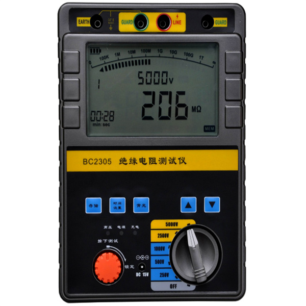 4、BC2305型 輸出電壓:250V 、500V、1000V、2500V、5000V五擋,量程范圍:4MΩ-200GΩ,吸收比、極化指數(shù)測(cè)試;短路電流3.3mA。